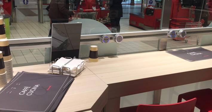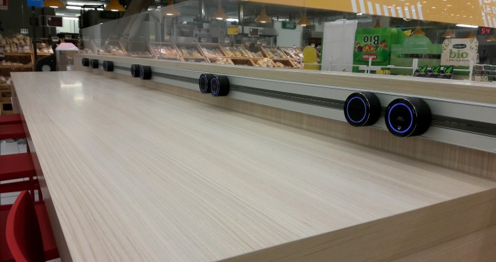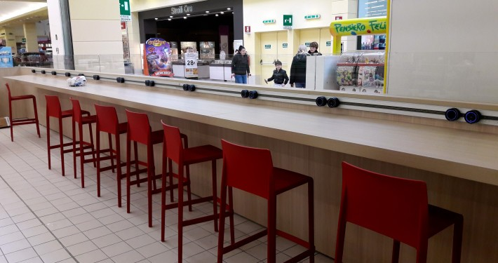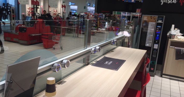 以下图片展示了购物中心餐饮区的电气化方案。项目选用了全电气化 WPR-1 型材,并嵌入了配备安全锁的Premium 适配器(意大利标准插座及 USB 充电器)。从图片中可以看到,通过将 Power track 系统集成到餐饮区,人们不仅能在此享受美食、放松身心,还能同时处理邮件或为智能手机 / 平板电脑充电。